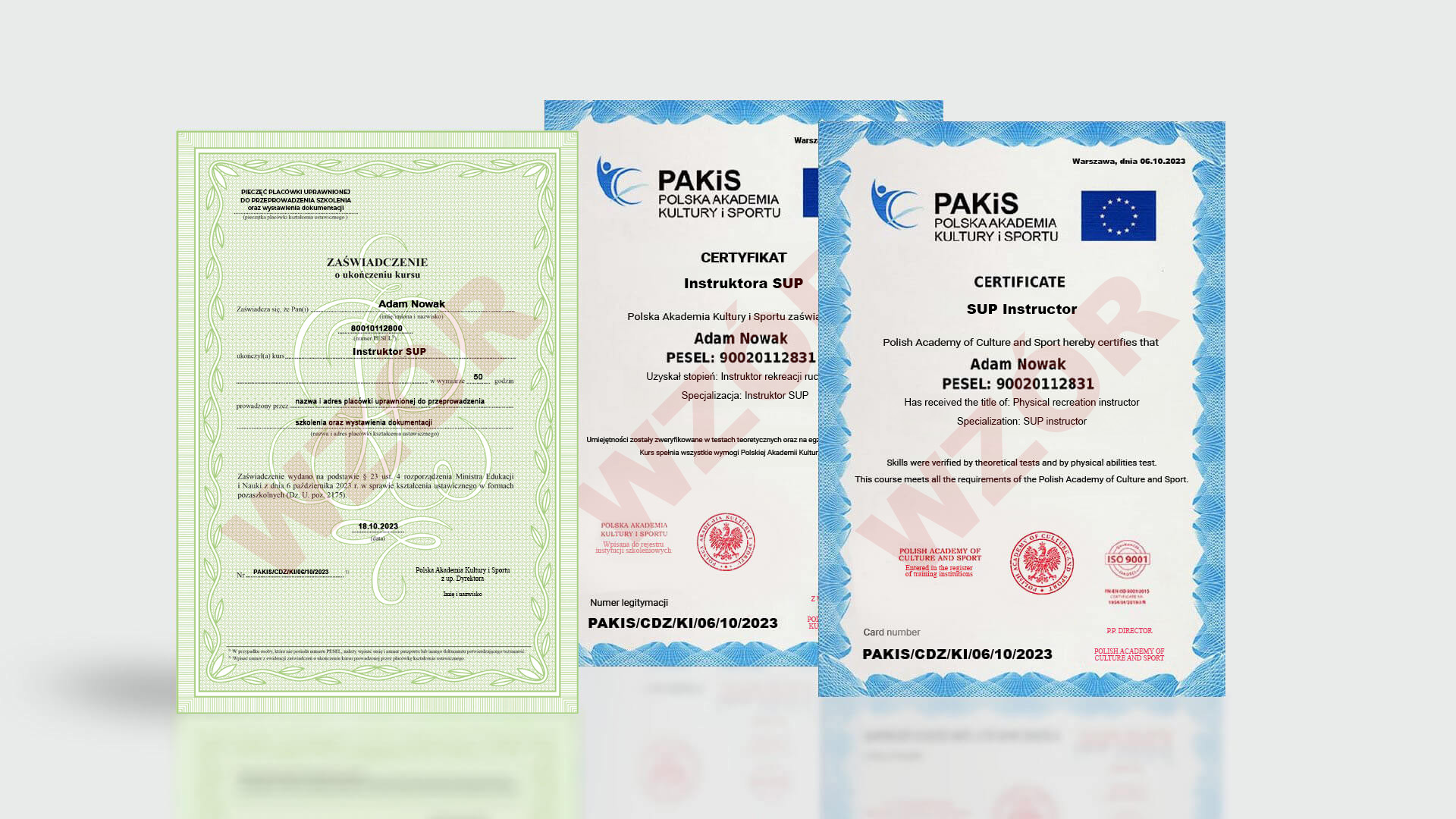Po ukończeniu Kursu Instruktora SUP absolwent otrzymuje dokumentację zgodną z wymogami MEiN i certyfikat instruktora rekreacji ruchowej o specjalizacji: instruktor SUP (w języku polskim i angielskim) oraz dodatkowo: